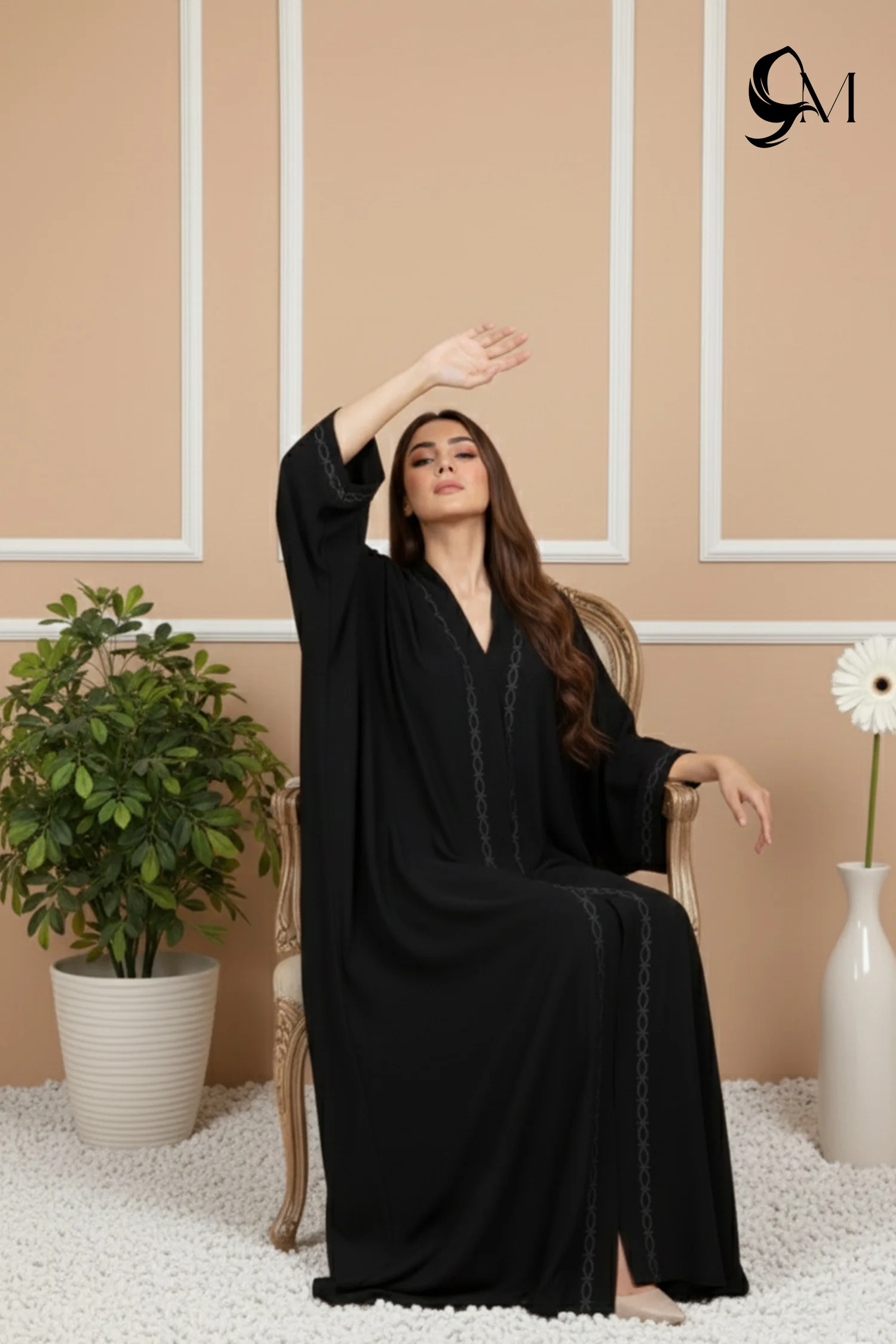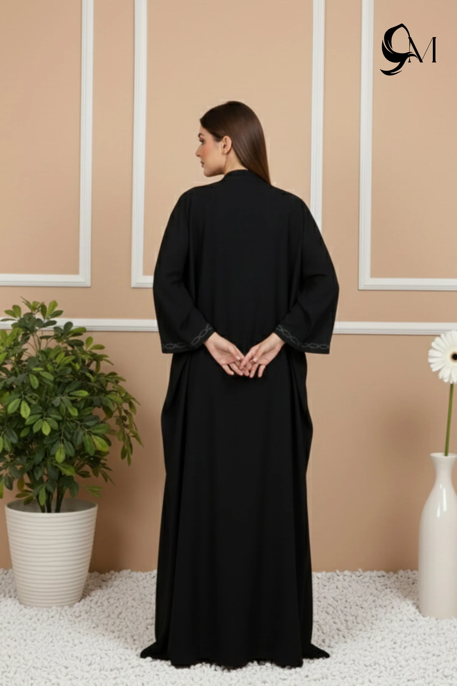 This abaya falls smoothly in a soft Charcoal shade, giving a calm, modern look that feels refined and balanced. Its gentle flow creates a graceful shape on the body, while the clean neckline keeps the appearance polished. Subtle artistic detailing along the front and sleeves adds quiet character without standing out too much. Overall, it looks elegant, confident, and effortlessly suitable for work, formal days, or everyday wear.- Styling Tips Use Grey Tones and Silver: Pair the abaya with a lighter silver or slate grey hijab to create a clean, modern look. Add silver jewelry, like a simple cuff or earrings, to catch the light and make the dark grey look more luxurious.Focus on Flow and Form: Have the model use slow arm movements to show off how the fabric drapes and moves. Use nude or metallic pointed heels to keep the model looking tall and polished.