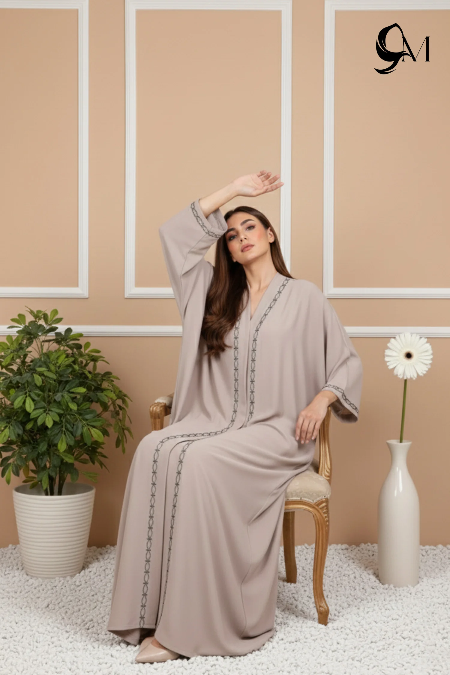 This abaya falls smoothly in a soft mushroom shade, giving a calm, modern look that feels refined and balanced. Its gentle flow creates a graceful shape on the body, while the clean neckline keeps the appearance polished. Subtle artistic detailing along the front and sleeves adds quiet character without standing out too much. Overall, it looks elegant, confident, and effortlessly suitable for work, formal days, or everyday wear.- Styling Tips Balance Embroidery with Minimalist Accessories: When styling an abaya with intricate embroidery, choose a solid-colored hijab in a neutral shade (like cream or beige) and avoid large statement jewelry; instead, opt for delicate pieces such as small stud earrings or a slim watch to ensure the craftsmanship of the embroidery remains the focal point.Define the Professional Silhouette: For a polished presentation look, pair the abaya with closed-toe footwear like pointed-toe heels or loafers and ensure the length is tailored to sit exactly at the ankle to maintain an elegant, elongated frame.