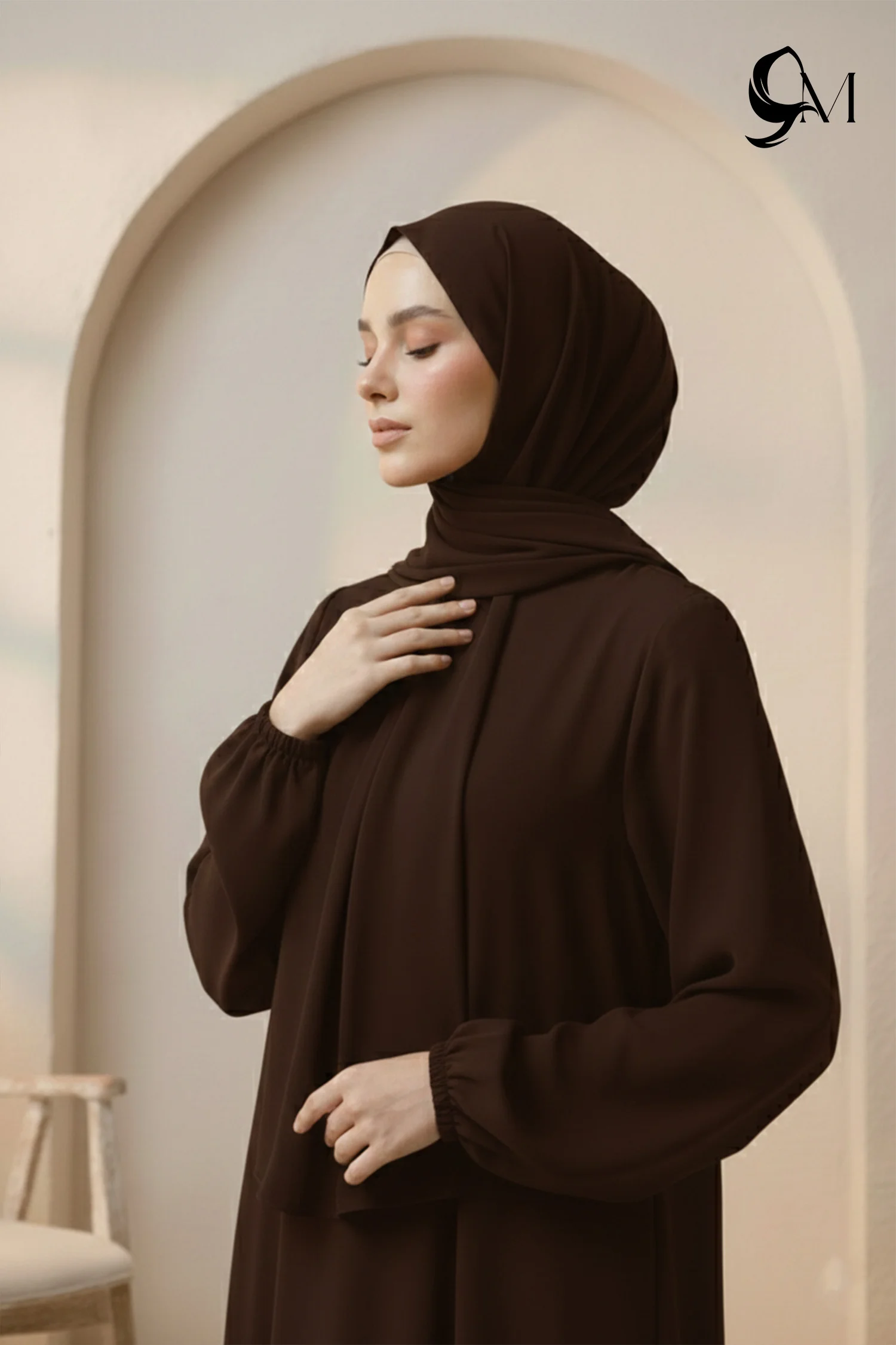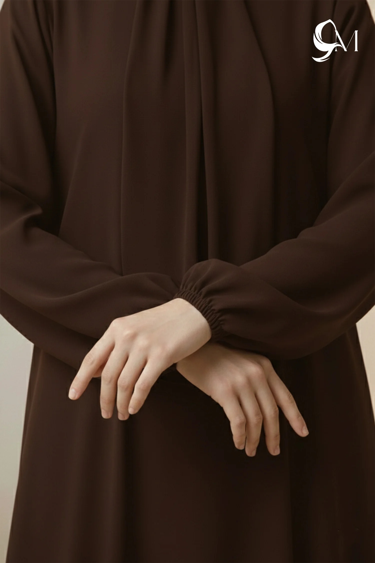 This abaya creates a strong yet elegant look in an Espresso shade that feels rich and confident. It falls straight and smooth, giving a clean, graceful appearance that looks polished from every angle. The softly shaped sleeves add a gentle modern touch, balancing simplicity with style. Overall, it looks refined, composed, and effortlessly sophisticated—perfect for both everyday wear and special occasions.- Styling Tips Brighten with Warm Earth Tones and Neutrals: To highlight the depth of the espresso fabric, pair it with a cream, beige, or warm tan hijab to create a balanced, high-contrast look that brightens the model's face. For a more vibrant "autumn" aesthetic during the presentation, incorporate accessories in burnt orange, mustard yellow, or terracotta, which enhance the natural warmth of the brown and add a pop of seasonal color.Utilize Metallic Accents and Textured Layering: Elevate the garment's sophistication by adding gold or bronze jewelry, such as a structural cuff or a delicate pendant, which complements the "regal" feel of deep brown fabrics. To add visual interest and dimension on stage, encourage the model to showcase the abaya’s flow through slow, graceful movements that emphasize the fabric's texture, and finish the look with nude or metallic heels to maintain an elongated, polished silhouette.