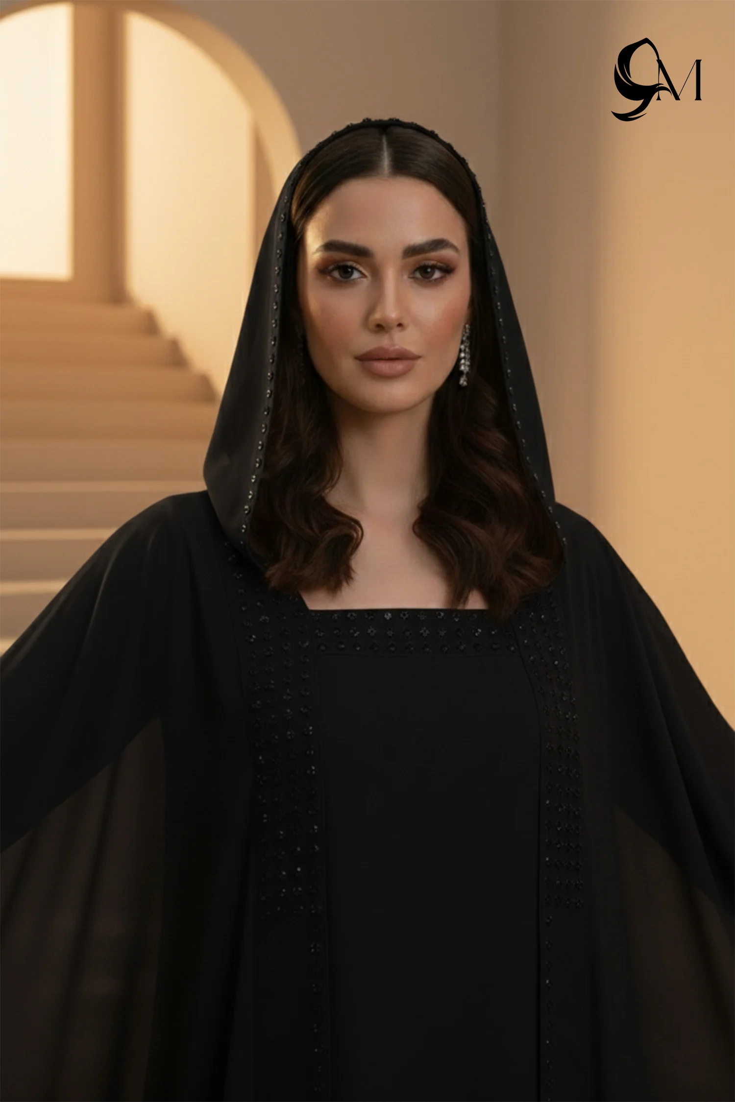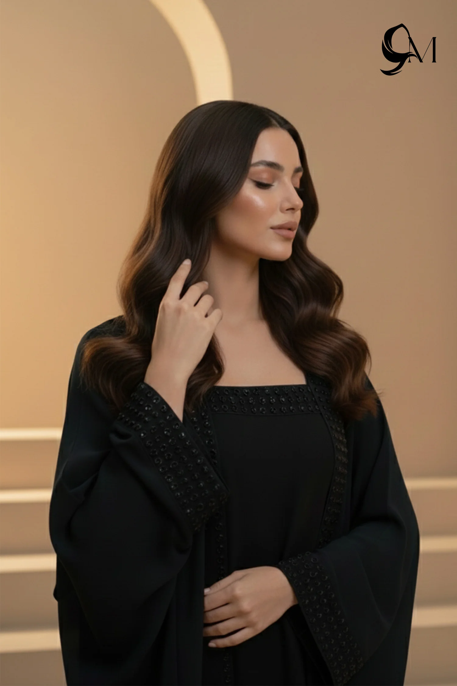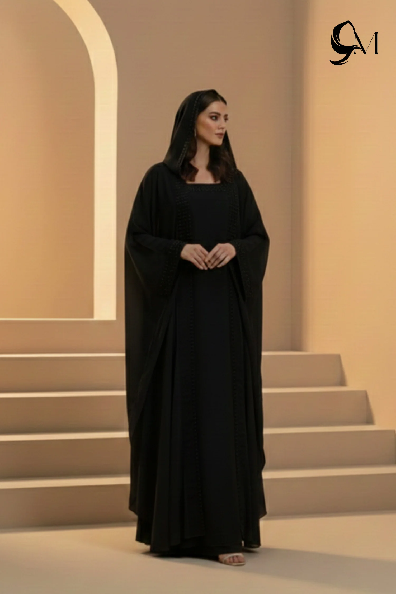 This abaya flows like liquid in a Black shade, with wing-like sleeves that open gracefully with every movement. Its broad, seamless drape creates a dramatic, airy silhouette that feels regal and elegant. The square neckline with subtle shimmer adds a touch of sparkle, making the overall look striking yet effortlessly graceful—perfect for evening gatherings, celebrations, and special occasions.- Styling Tips Define the Form with Statement Accents: Use a thin metallic belt (gold or silver) to cinch the waist, which adds structure and a modern "power" silhouette to the flowing fabric. Complete the look with minimalist high-shine jewelry and pointed-toe heels to catch the light during the presentation, ensuring the deep black fabric appears dynamic rather than flat.