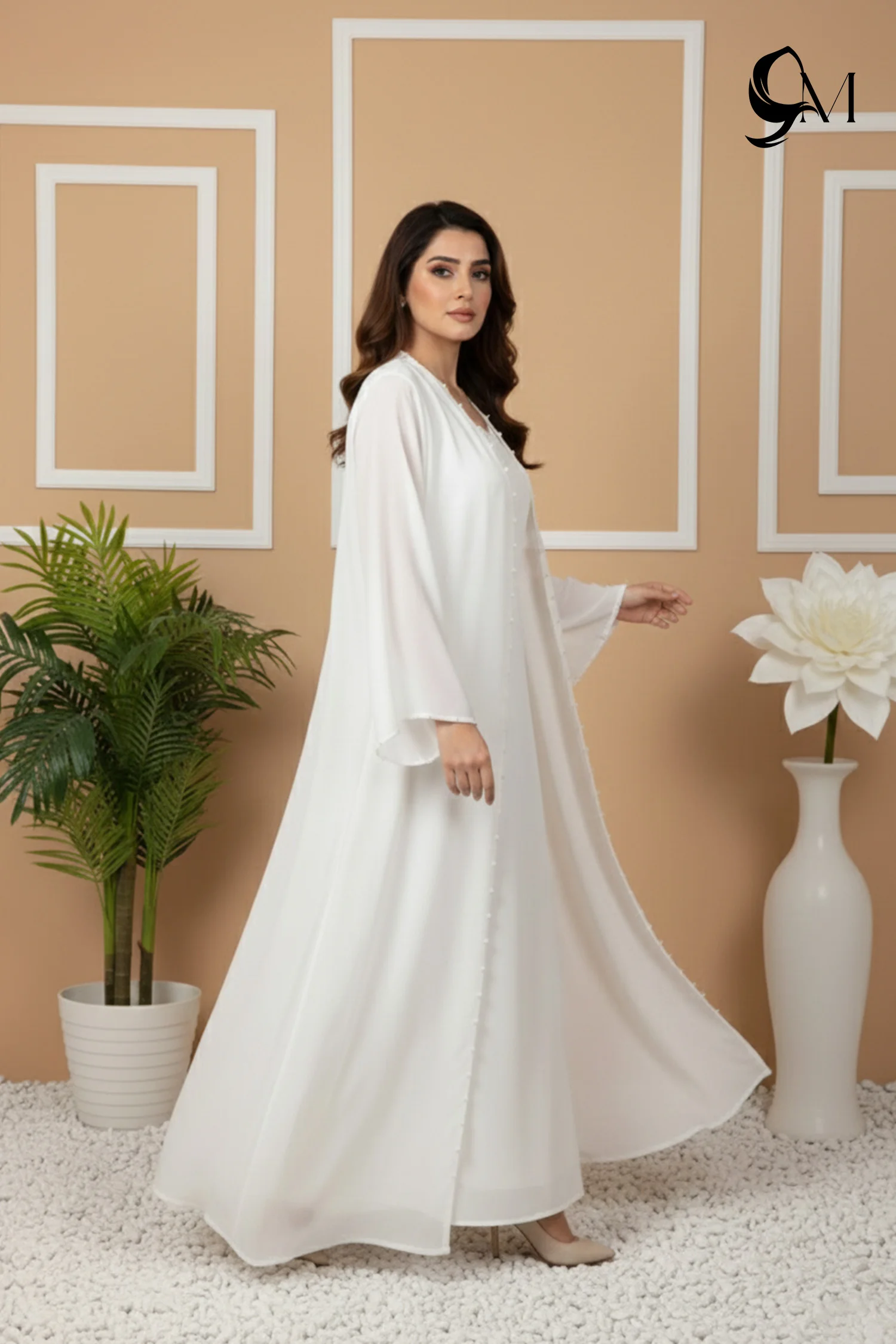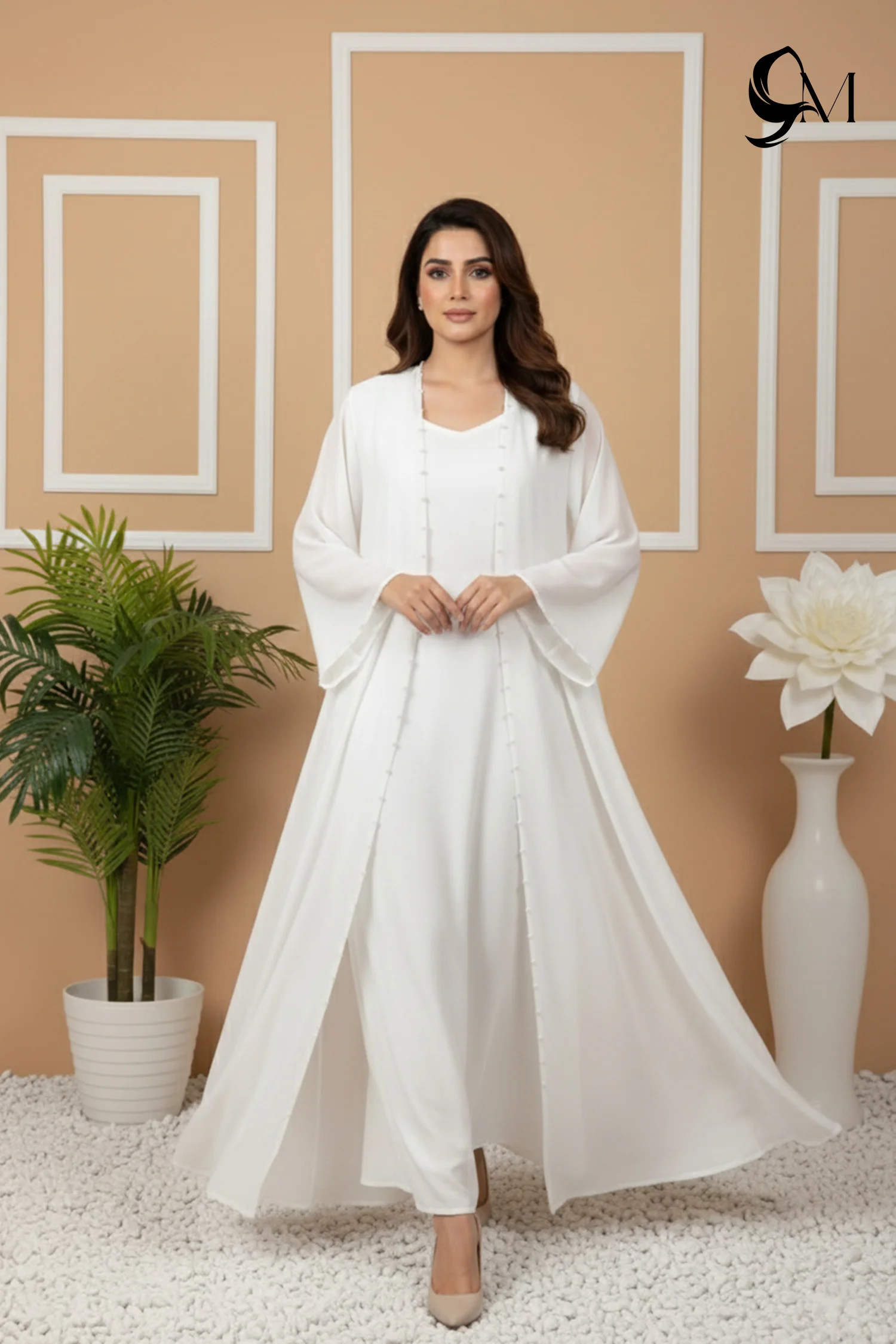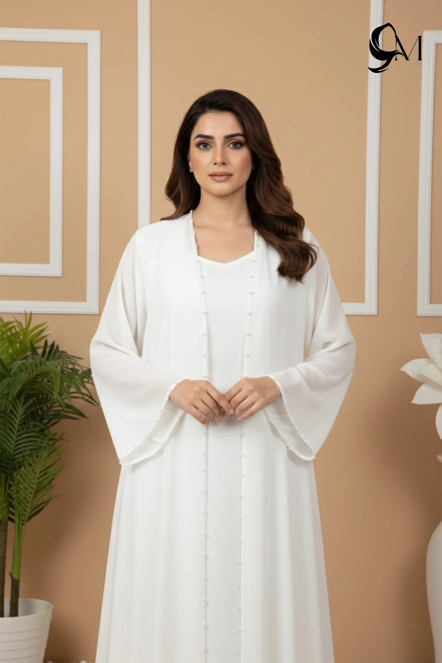 This abaya appears light and radiant in a pure white tone, flowing softly with every step. The layered design gives it a graceful depth, while the gentle flare creates an elegant, elongated look. Subtle pearl accents catch the light beautifully, adding a refined glow without feeling heavy. Overall, it looks serene, polished, and effortlessly sophisticated—perfect for meaningful celebrations and special moments.