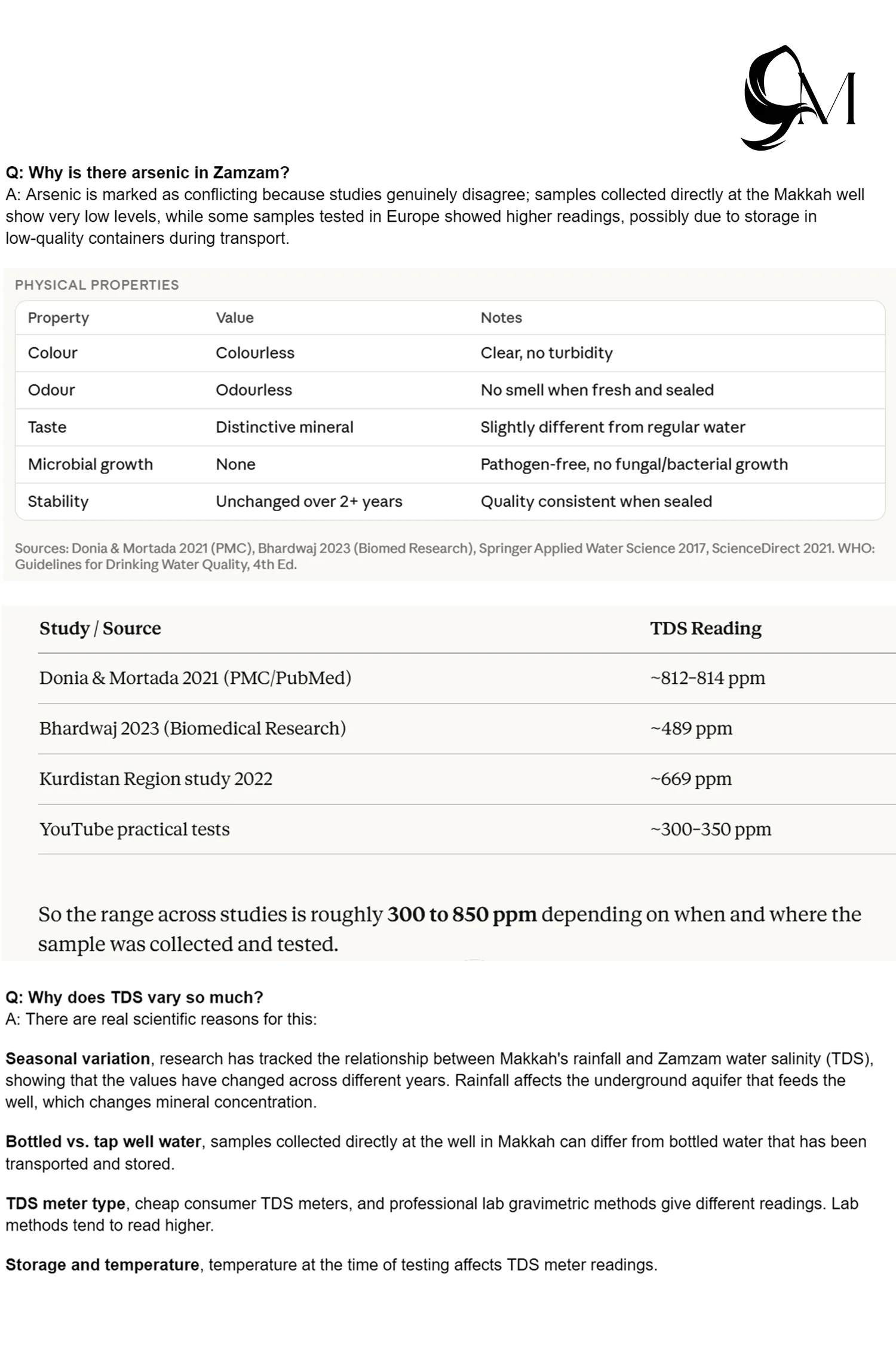 Seasonal variation, research has tracked the relationship between Makkah’s rainfall and Zamzam water salinity (TDS), showing the values have changed across different years. Rainfall affects the underground aquifer that feeds the well, which changes mineral concentration.